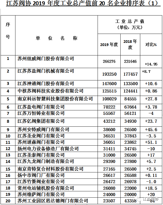 据江苏阀协秘书处对已收到的102家主要会员企业2019年度统计年报表汇总,(由于刚收到苏州纽威阀门股份有限公司2019年统计年报数据),江苏阀门行业2019年工业总产值完成实绩为203.0395亿元,与2018年同期188.3639亿元,增7.79%;工业销售产值为198.3863亿元,比上年2018年186.1605亿元,增长6.57%;利税总额实绩为27.6875亿元,比2018年同期的22.9111亿元,增20.85%.产销利三大指标同比均增长,其中产值增7.79%,销售增6.57%,利税增20.85%。