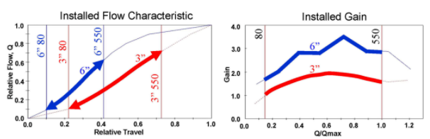 可以帮助说明者选择阀门的两个工具是正在考虑应用的所有阀门的已安装流量特性1和已安装增益2的图表。图1显示了针对相同应用的两种可能的阀选择(部分球阀,其固有流量等百分比)的安装流量特性和安装增益,其中该过程包括长管道运行和离心泵。6英寸的阀门将在10%的行程范围内控制所需的80至550 gpm的流量范围,而在40%的开启范围内则仅控制其全部行程能力的30%,这使得流量对阀门位置变化非常敏感。在低端没有太多的安全系数,超过最大流量550 gpm的流量浪费了很多,这既昂贵又不必要。