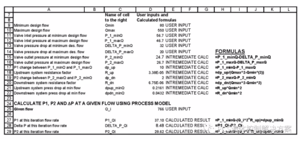 在表1中,基于过程模型,单元格D25中的流量条目将产生该流量时的P1,P2和增量P(控制阀两端的压降)值。在D25中,唯一需要用户费力的流量输入是所考虑的阀门完全打开时的流量。这需要一些简单的猜测工作。