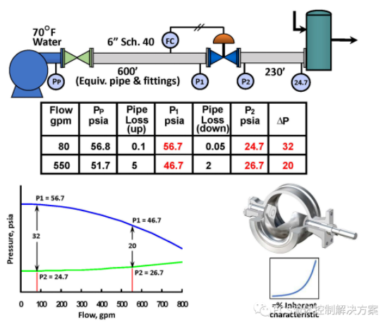 表1至表3中的样本计算基于图2所示的系统。系统的静态分析产生了表中所示并以图形方式显示的压力值。该计算基于对3英寸部分球阀的分析,该球阀具有等百分比的固有流量特性。