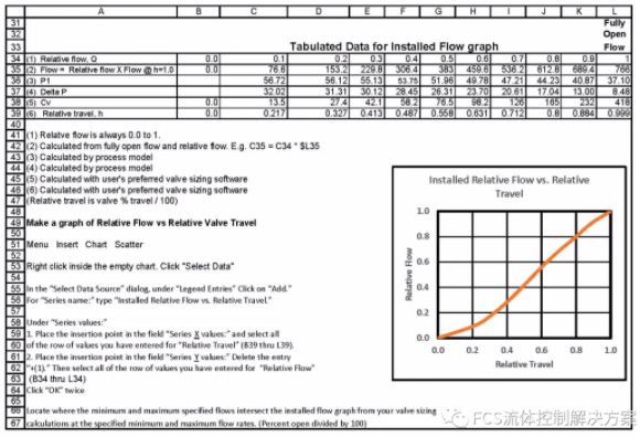 在工作表(表2中所示)的单元格L35中输入此完全开放的流量,然后在第35行中填写所有剩余流量。(全开流量X相对流量。)这可以通过简单的公式或手动完成。同样,用过程模型和CV中的P1和Delta P来完成L列,并根据阀门尺寸调整程序来完成相对行程。可以使用过程模型和大小调整程序来填写其余列表数据。