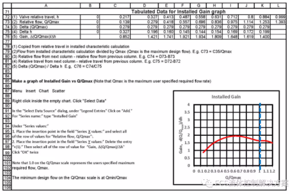 在安装的增益图中,给定的最大指定流量在Q / Qmax刻度上始终为1.0。Q / Qmax标尺上的最小设计流为Qmin / Qmax。对于用户正在过程D的第9列至第14列中输入的系统参数表示的系统所考虑的任何阀门尺寸或样式,已安装增益图的Q / Qmax刻度上的这两点将相同。模型,可以轻松比较它们的控制功能。