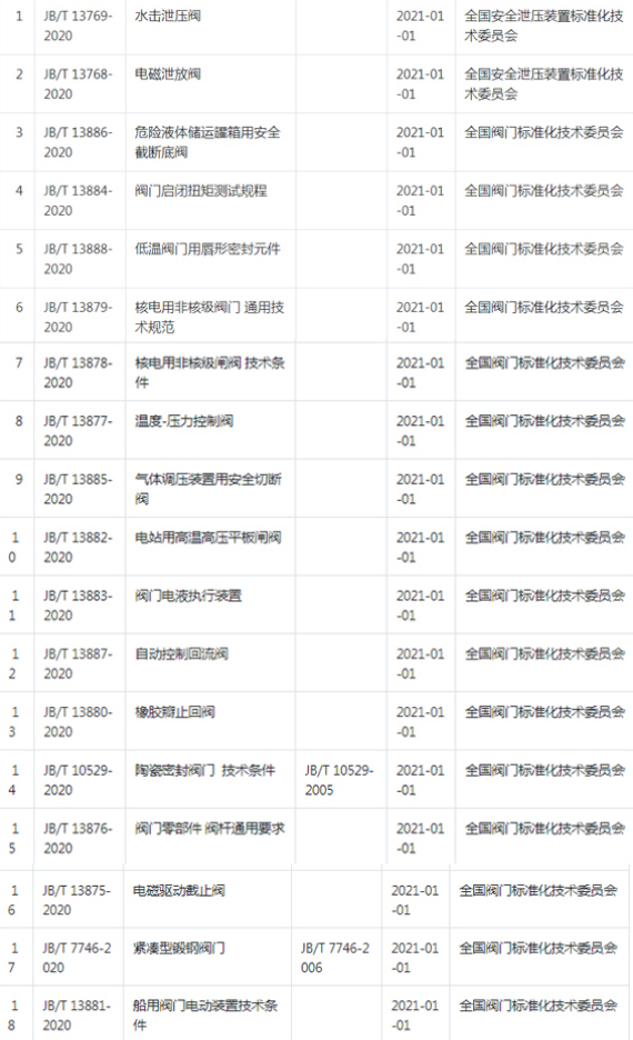 根据中华人民共和国工业和信息化部公告2020年 第15号,工业和信息化部批准公布了一批行业标准,其中由全国阀门标准化技术委员会和全国安全泄压装置标准化技术委员会归口的标准共18项,如下表: